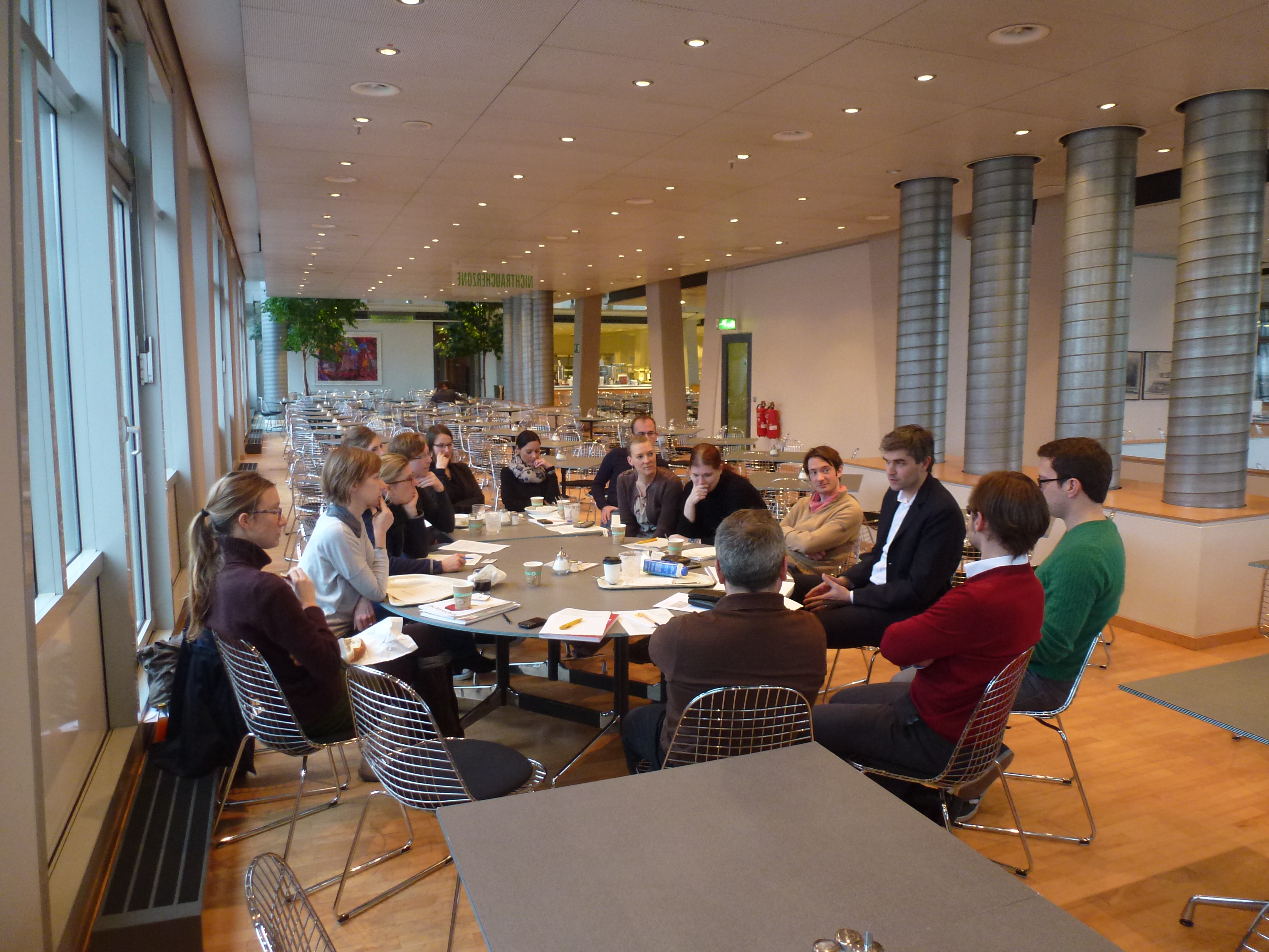 Nein, machen Sie sich keine Sorgen, wir leiden nicht unter Größenwahn. Was Sie auf dem Bild sehen, ist nicht unsere neue Immobilie (da ist der Vertrag immer noch nicht unterschrieben, es gibt noch ein, zwei Punkte, über die wir uns einigen müssen, aber immerhin – für die technische Internetanbindung scheint es eine Lösung zu geben…). Was Sie auf dem Bild sehen, ist die Kantine von Gruner+Jahr, genauer: ein kleiner Teil davon. Und mitten in der leeren Halle – es ist morgens um 9.30 Uhr – ein erstes Treffen des neuen impulse-Teams (einige werden noch dazustoßen). Wir stellen uns einer nach dem anderen kurz vor: Auch wenn die meisten bereits lange zusammengearbeitet haben, kennt nicht jeder jeden. Ich gebe einen kurzen Überblick über den Stand der Dinge: zu Personal, Vertrieb, Vermarktung, Druck, Redaktionssystem – und der Immobilie. Schnell ist klar: Wir haben etwas Wichtiges vergessen: einen Kicker und eine Kaffeemaschine. „Notfalls“, sagt eine Kollegin, die bereits in zwei Start-ups gearbeitet hat, „legen wir alle etwas Geld zusammen.“