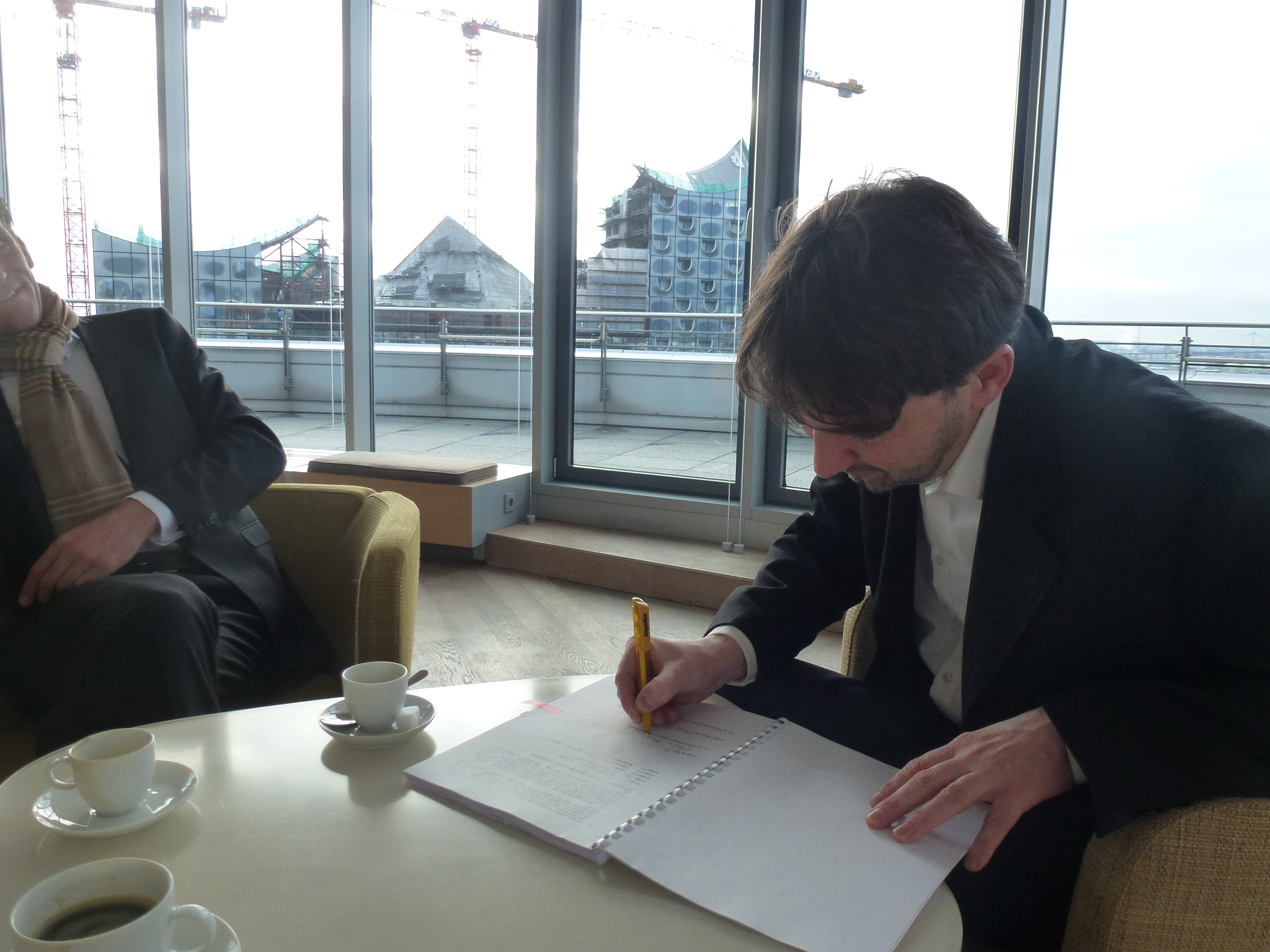 Wie genau das jetzt gelaufen ist – das verschwimmt bereits in meiner Erinnerung. Zuletzt drehte sich einiges in meinem Kopf. Als ich gestern erneut bei der Anwältin nachhakte, schrieb sie mir: „Herr Förster, eine Überschrift gibt es nicht, aber eine Unterschrift! Die Unterlagen sind auf dem Weg zu mir.“ Ich hatte ihr – ich bin also doch noch Journalist – geschrieben: „Gibt es inzwischen eigentlich eine Überschrift?“ Wie gesagt, eine Rekonstruktion wäre angesichts der Vielzahl an Beteiligten und der endlosen Volten wohl zwecklos. Begnügen Sie sich mit dem Bild des unterschreibenden Unternehmers….