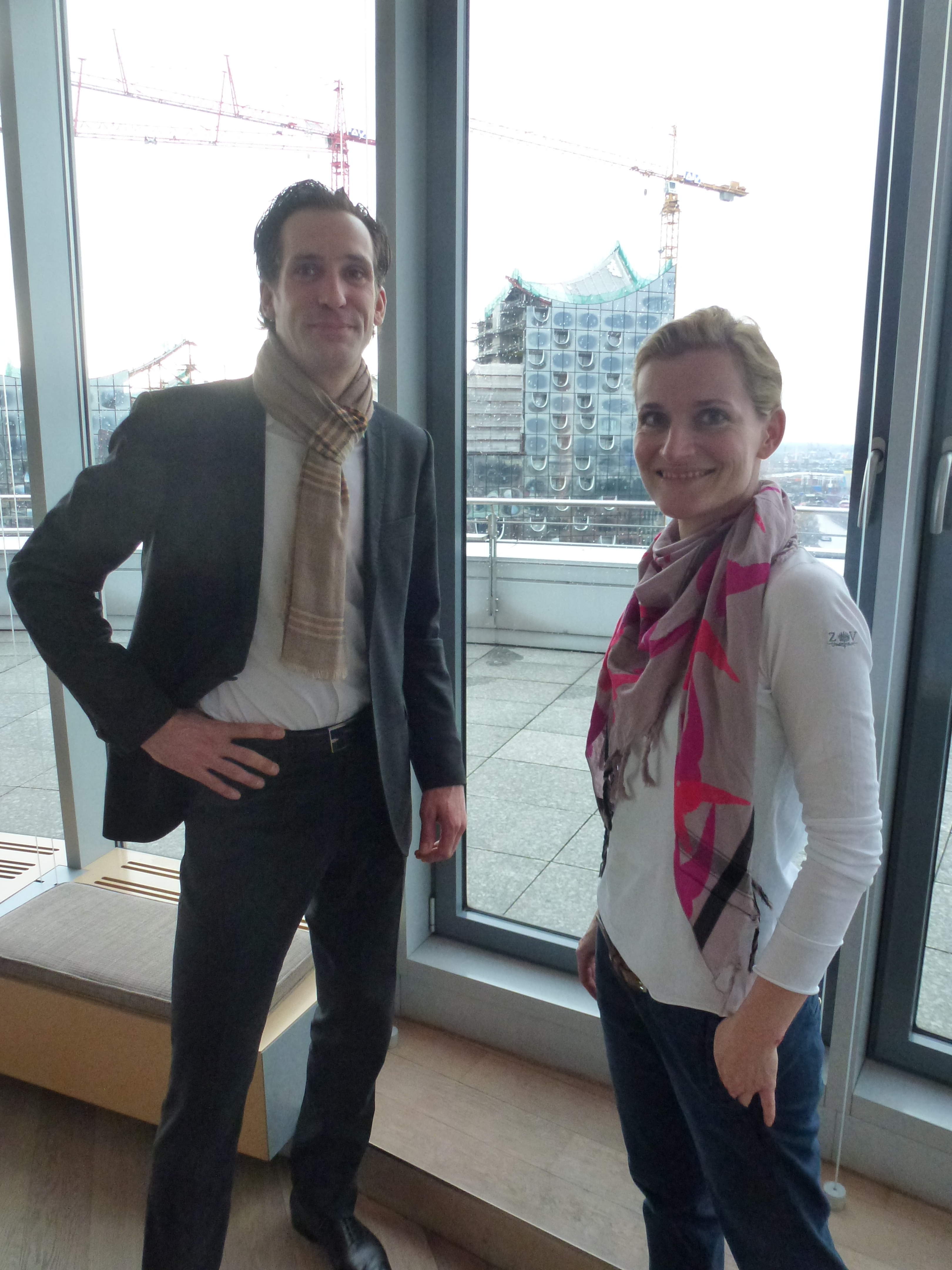 dem Makler Lars Kneller von CBRE und der Anwältin Sabine Kaben von Taylor Wessing, deren Büro übrigens, im 21. Stock am Sandtorkai, einen unglaublichen Blick auf Hamburg gewährt. Von dort oben sieht Raumschiff Enterprise (Gruner+Jahr) ziemlich klein aus, und die Elbphilharmonie (im Hintergrund) nach wie vor ziemlich unfertig.
