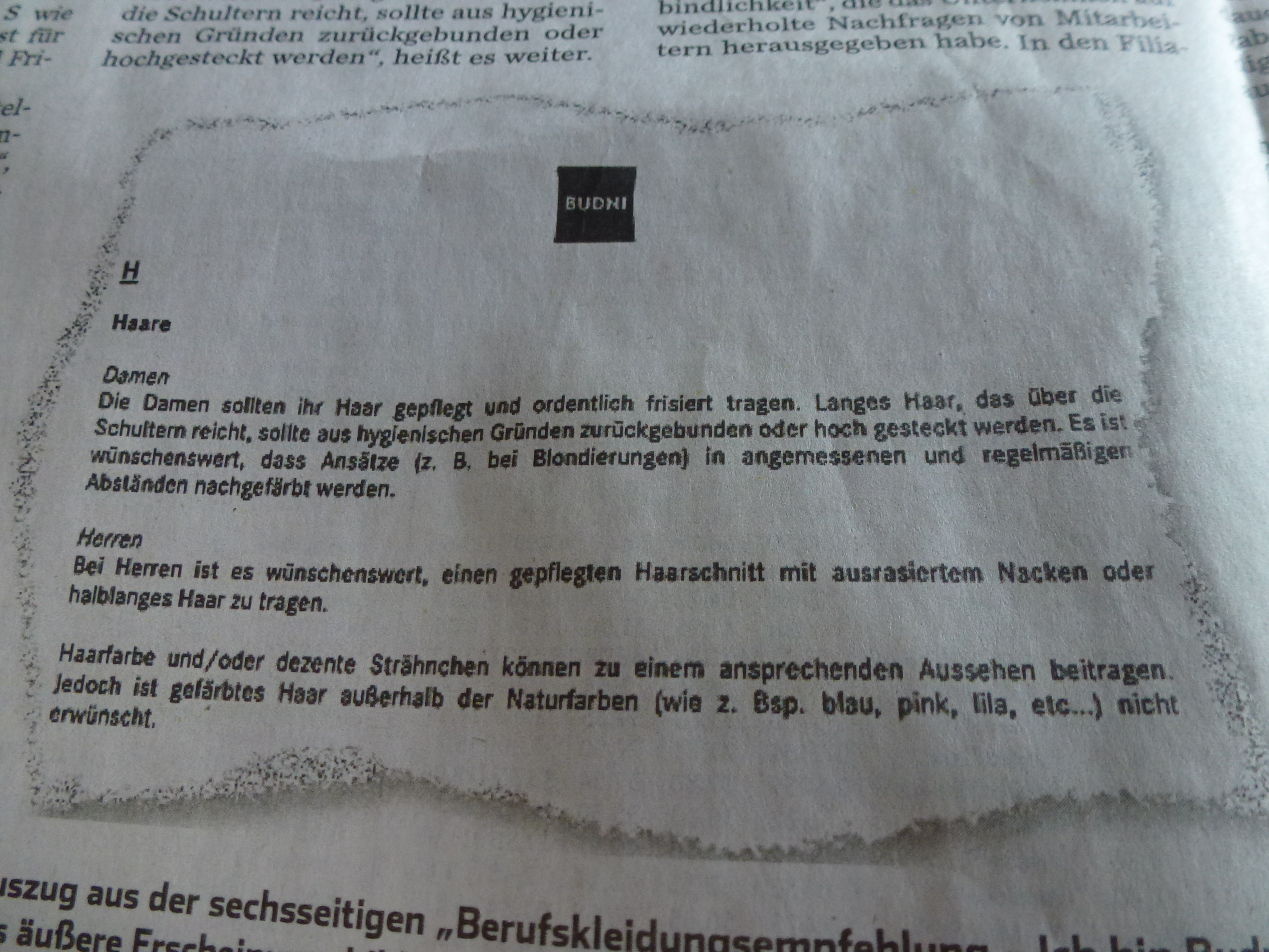 1. Versteckt sich zwischen den Zeilen da die kopfschüttelnde Frage ob es überhaupt opportun ist so eine interne Leitlinie vorzugeben? Von der Bundeswehr über McDonalds bis hin zum Abercrombie & Fitch Store gibt es Vorgaben wie Mitarbeiter sich zu kleiden und zu verhalten haben. Ist das tatsächlich ehrenrührig? Würde der geneigte Kunde es nicht als unauthentisch empfinden beim Bioladen um die Ecke von einer aufgedonnerten Blondine mit fingerdickem Makeup und falschen Fingernägeln seine regional geernteten Schrumpelkartoffeln in die Papiertüte gelegt zu bekommen. Das Auftreten der Mitarbeiter ist ja ein nicht ganz unwesentliches Merkmal wie Kunden einen Anbieter erleben … zumal im Handel. Mag sein das Budni es nicht einfach in einem Memo verteilen sollte, aber in der Sache ist es doch eigentlich nachvollziehbar, oder?