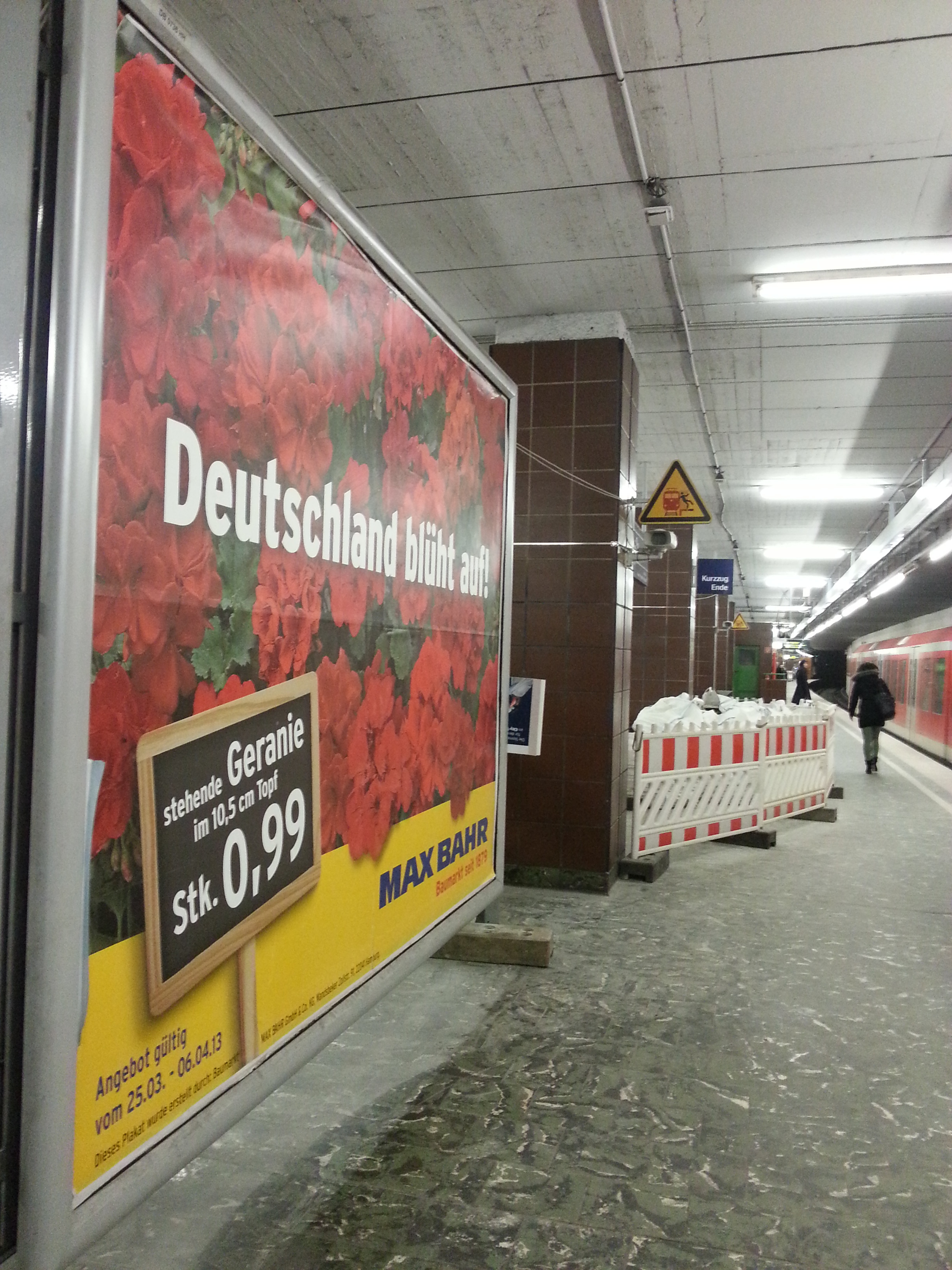 Auf dem Weg nach Berlin: Noch ist unklar, wo unsere Berliner impulse-Kollegen ab Mitte April unterkommen. Bis Mitte des Monats, so die Abmachung, können wir noch in den Räumen von Gruner + Jahr in der Friedrichstraße arbeiten. Und dann? Ich hoffe, dass ich heute etwas klar machen kann. Verrückt, was einem plötzlich ins Auge fällt, wenn man wie heute unterwegs ist und wie dann Assoziationsketten ausgelöst werden: Max-Bahr-Werbung = Dirk Möhrle (treffe ich heute), Pflanzen im Baumarkt = Dirk Möhrles damalige Idee. 0, 99 Euro = Rabatt = schlechte Idee, zumindest für uns. Deutschland blüht = gute Idee, oder denkt da noch jemand an Helmut Kohl? (wahrscheinlich nicht die Geranienkäufer). Baustelle = passt. Schluss, der Zug kommt.