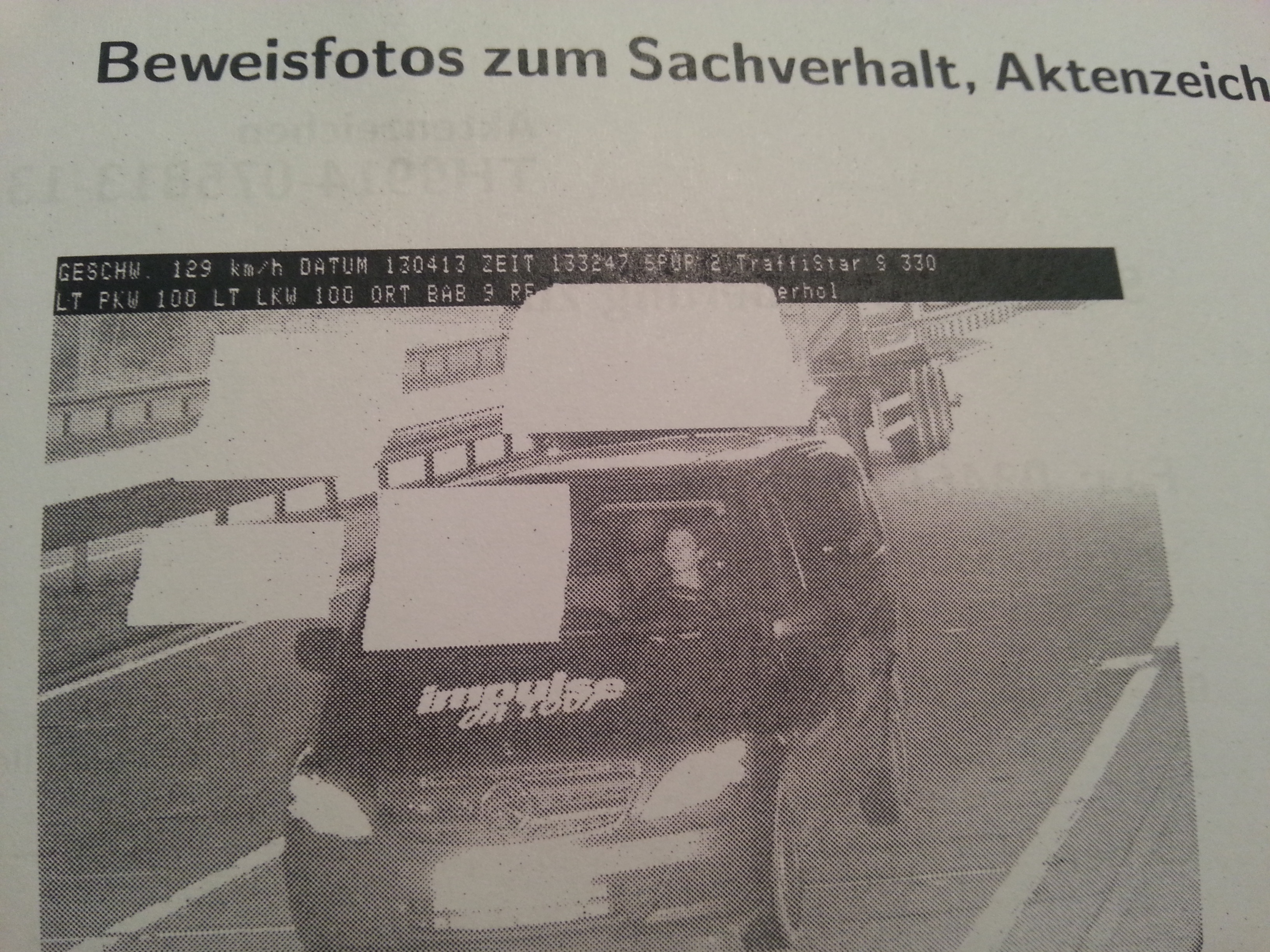 Gut zu wissen: Wir waren offenbar nicht die einzigen, die auf unserer Deutschlandtour Mitte April Fotos geschossen haben. Auch die Thüringer Polizei war fleißig und nahm unseren Mercedes-Bus mit dem „impulse on tour“-Logo ins Visier. Heute erhielt ich – vielen Dank! – einen Brief mit ein paar Fotos, leider schwarz-weiß, auch die Kontraste und die Schärfe würden unserer Fotoredakteurin nicht gefallen. Egal. Wer hätte gedacht, dass unsere Aktion auf so viel Interesse stoßen würde.