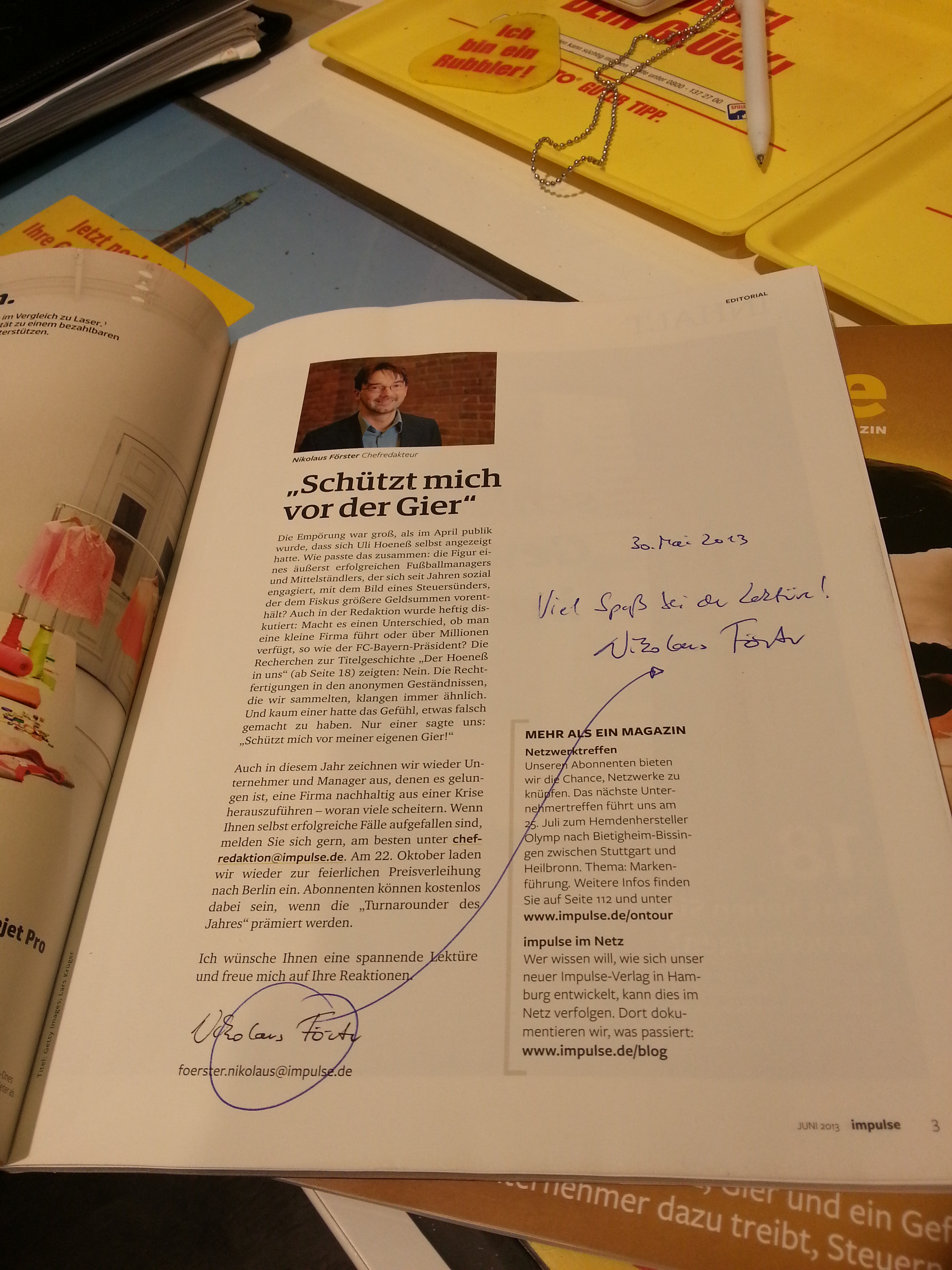 Also, liebe impulse-Leser, wer noch kein Exemplar hat, dem empfehle ich den Camel-Shop im EKZ Hamburger Meile (Hamburger Straße 49, Hamburg-Barmbek Süd). Was wird der Händler für Augen machen, wenn jemand vorbeikommt und nach einem handsignierten Exemplar fragt!