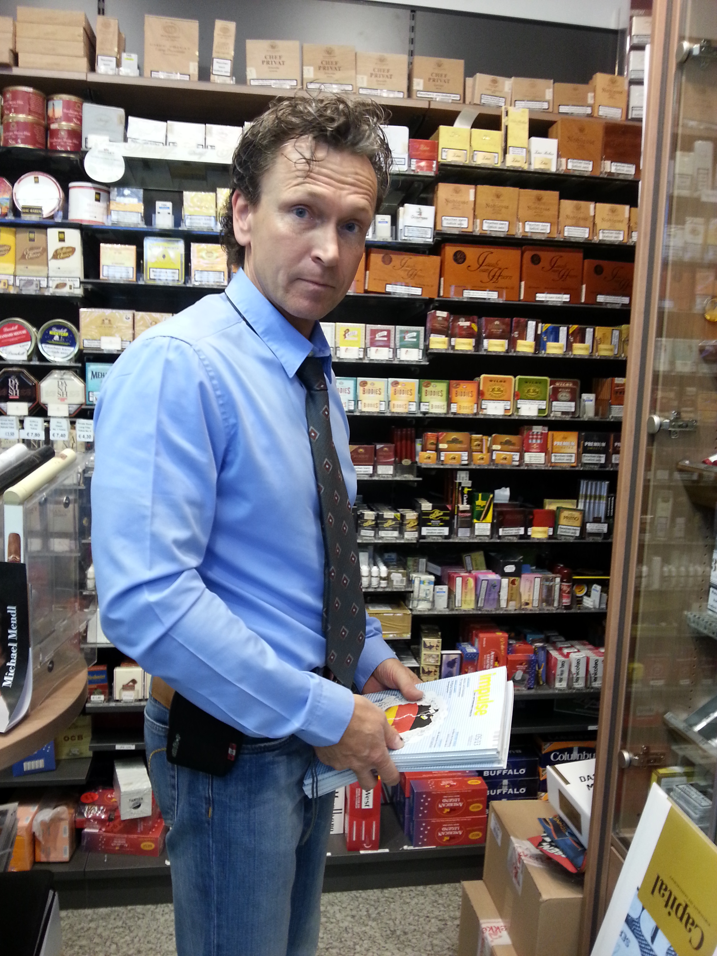 „… und heute habe ich noch einen Gast dabei, den Chefredakteur und Inhaber von impulse“, sagt Radssat, wenn er die Händler begrüßt. Freundliches Nicken. Manchmal auch Stirnrunzeln. Ich werde kurz gemustert. Impulse? Scheint kein Bestseller zu sein. Bei der ersten Station treffen wir auf einen Valora-Angestellten. Unternehmer will er nicht werden, sagt er. Er fände es schön, angestellt zu sein. Auch das Franchise-System von Valora (http://www.valoraretail.de/de/franchise/) kann ich ihm nicht schmackhaft machen. „Das sollen andere machen.“ In einem Supermarkt finden wir impulse zwischen GQ und der „Szene Hamburg“ – von Capital keine Spur. Und die Chefin will nicht mit uns reden. In einer Thalia-Filiale gibt es impulse nicht. „Ein Renner ist aber die Hitler-Satire ‚Er ist wieder da'“, verrät mir die Verkäuferin. Ein anderer Händler hat noch die Mai-Ausgaben von impulse im Regal, die Herr Radssat (siehe Foto) schnell wegräumt und dann wieder zurücklegt – weil die Juni-Hefte, die sich in dem großen Papierstapel neben der Kasse verstecken könnten, noch gar nicht ausgepackt wurden. Keine Zeit.