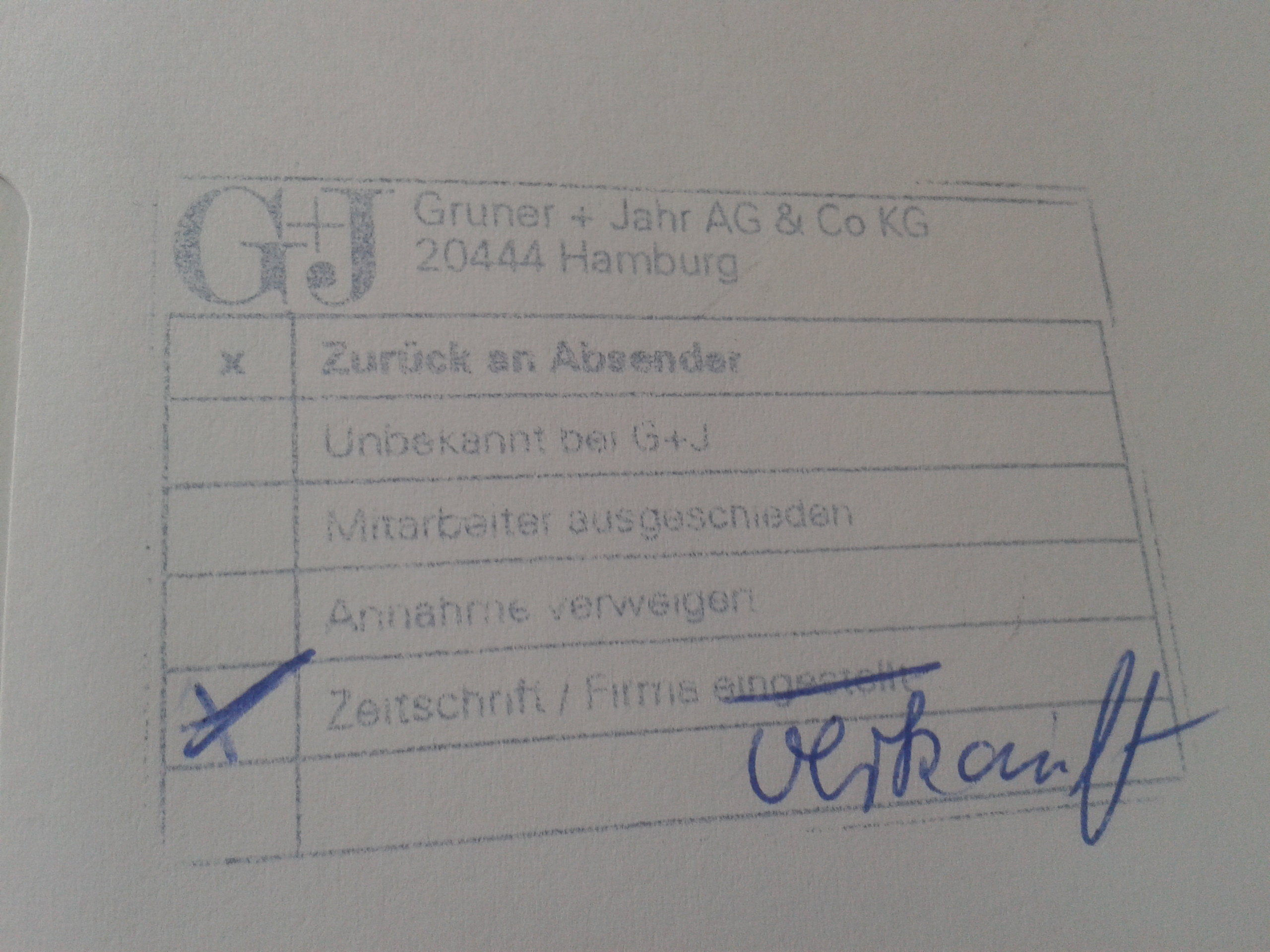 Alles hat seine Ordnung. Nur ist nicht mehr alles so, wie es einmal war, auch nicht bei den großen Verlagen. Höchste Zeit, mal die Stempel anzupassen. So sieht es aus, wenn uns noch Post an unsere alte Adresse am Hamburger Baumwall geschickt wird: