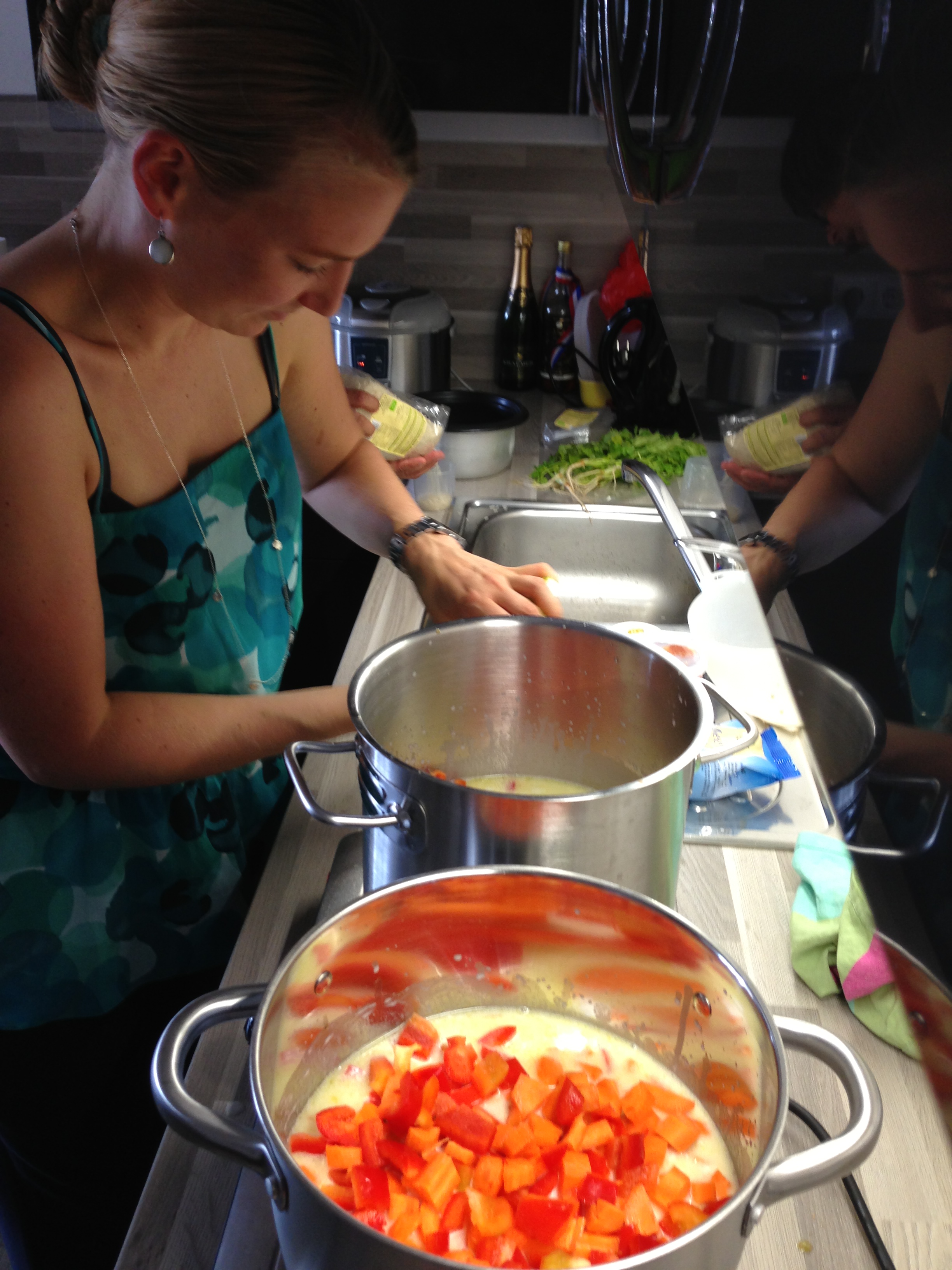 Nach einem halben Jahr in Hammerbrook ist klar: Es gibt eigentlich keinen Grund, der – tatsächlich sehr guten – Gruner+Jahr-Kantine hinterherzutrauern. Im Industriehof gibt es einen guten Italiener, außerdem im Viertel unzählige kleinere Restaurants und Cafés (die tagsüber proppevoll und abends geschlossen sind…). Und doch kam letztens die Idee auf, einmal selbst zu kochen, zumal direkt an der S-Bahn-Station, wenige Schritte vom Verlag entfernt, mitwochs die Gemüse- und Obsthändler ihre Stände aufbauen. Heute gab es die Premiere: ein vegetarisches Curry, gekocht von der Art Directorin und unserer Bildredakteurin. Pünktlich um 13 Uhr (als ginge es um einen wichtigen Drucktermin, der eingehalten werden muss …) war alles fertig. Lecker! Später wurde abgerechnet. 2 Euro für jeden. Auch das: konkurrenzlos.