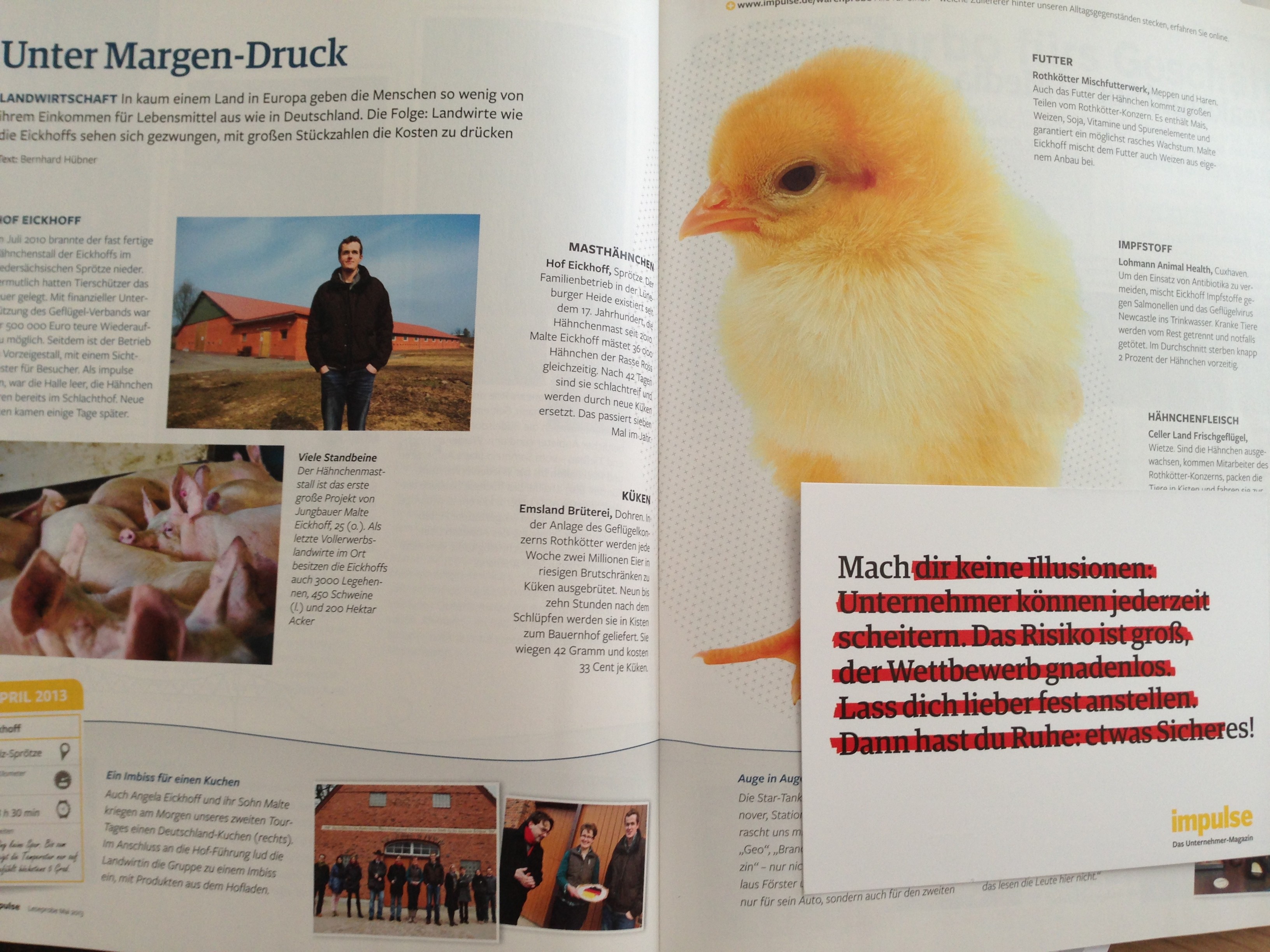 …. und unsere schöne Mach-es-Postkarte hatte auch gleich Verwendung gefunden. Auf das Ausfüllen der Kartenrückseite, einem Abo-Coupon, hatte die Leserin (ihren Namen und ihren Absender schickte sie mit) verzichtet. Kurz rätselten wir, was das solle. Eine Kollegin hatte eine Vermutung: Vor ein paar Wochen hatten wir etlichen Unternehmern ein kostenloses, 36-seitiges Leseexemplar über unsere impulse-Deutschlandreise (siehe https://www.facebook.com/media/set/?set=a.493760607339103.1073741828.103161599732341&type=1 und http://www.impulse.de/unternehmen/impulse-reist-quer-durch-deutschland) zugeschickt – um unsere Marke bekannter zu machen. Mit einem Team hatten wir im April in fünf Tagen zehn Firmen von Flensburg bis zum Bodensee besucht – darunter auch eine Bauernfamilie im niedersächsischen Sprötze, die konventionelle (!) Landwirtschaft betreibt. Sie mästet u. a. 36.000 Hähnchen (was auch damals schon in der Redaktion für Diskussionen gesorgt hatte). Und genau auf dieser Seite hatten wir die Mach-es-Postkarte aufgeklebt…