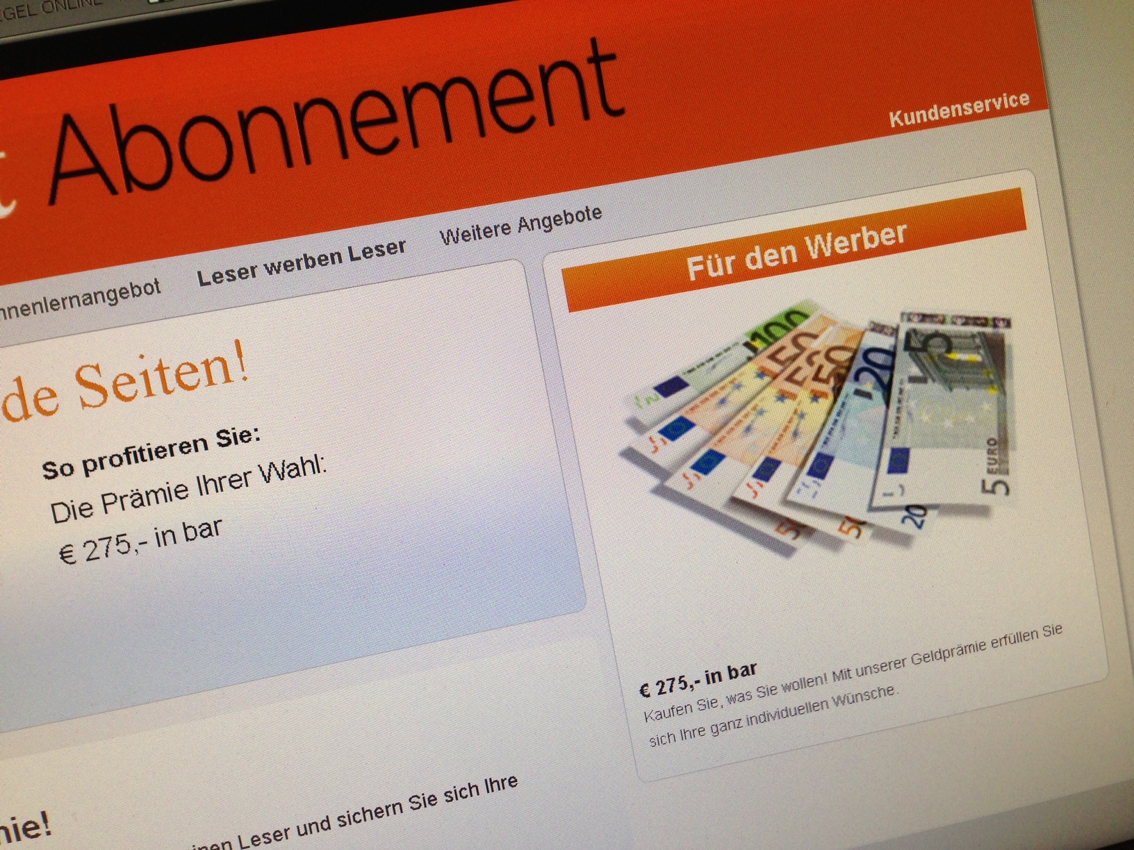 Ihnen reichen die 150 Euro nicht, die Ihnen die „Süddeutsche Zeitung“ als Aboprämie bietet? Dann könnten Sie zum Handelsblatt wechseln. 275 Euro. In Cash.