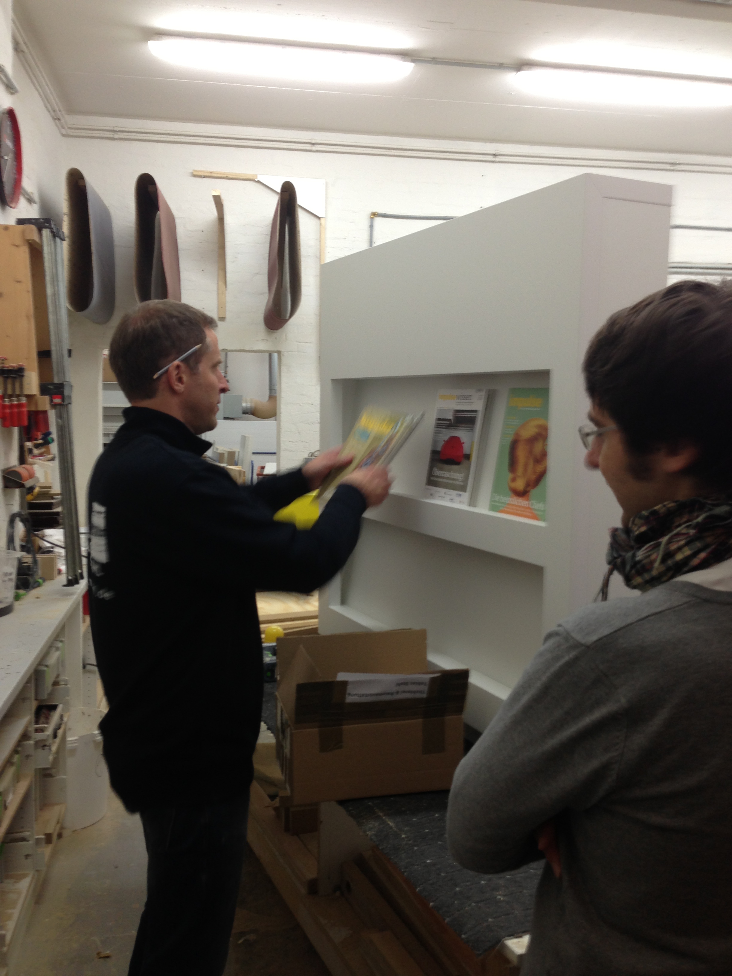 Anfangs gab es nicht mehr als eine Skizze, die ich in diesen Blog stellte (https://impulsemagazin.wordpress.com/2013/05/07/wie-ware-es-mit-einer-impulse-box/). Ich war überrascht über die vielen Reaktionen und Ideen, die uns Unternehmer schickten. Imme Vogel (http://www.immenwerk.de/) gaben wir den Auftrag, das Projekt im Detail zu planen. Seit ich gestern morgen beim Tischler war, bei Tobias Stahl (siehe Foto; http://www.t-stahl.de/), weiß ich, was das bedeutet.