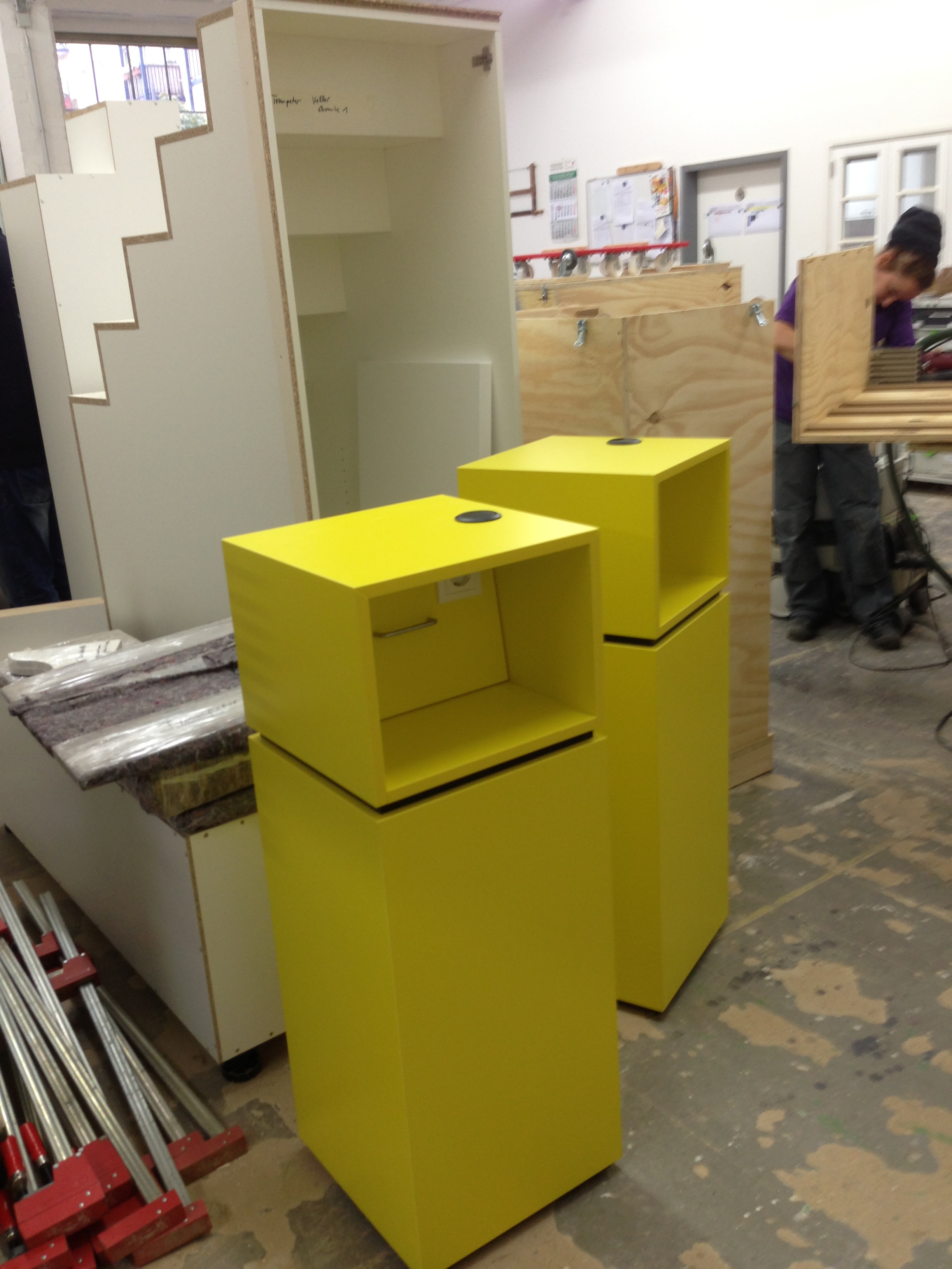 Wenn es nur die gelben Stelen wären, wäre es ja kein Problem. Da hängt aber sehr viel mehr dran, etliche Kubikmeter. Holz, lauter Holz. Dazu noch metallene Träger. Riesenbildschirme. Eine Lichtwand. Leuchtwürfel. Laptops. Kameras. Kabel etc. Zum Glück haben wir uns eine Rampe geleistet…