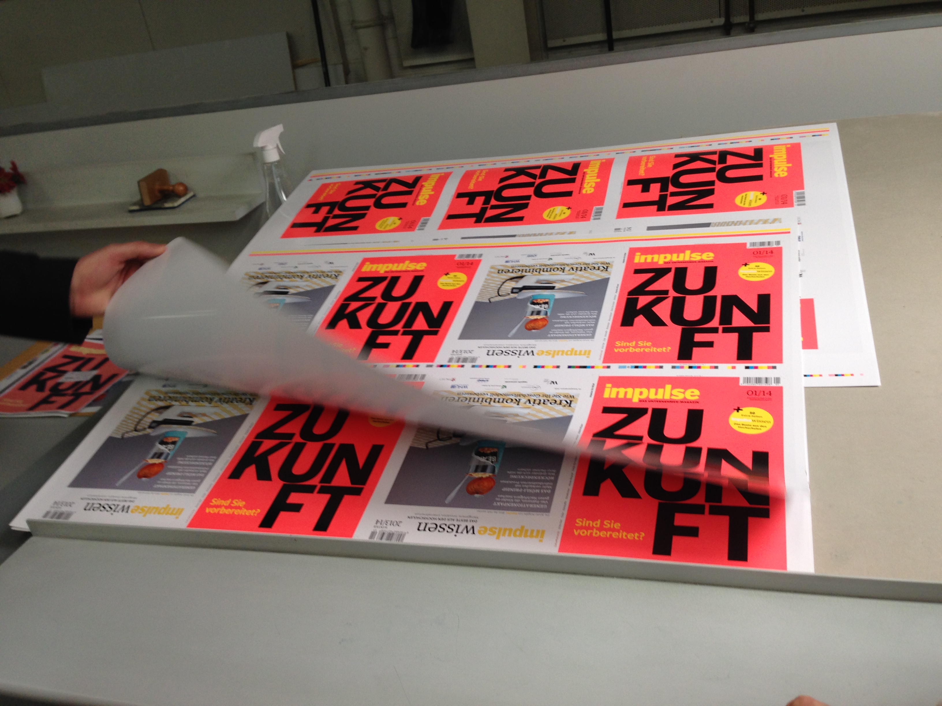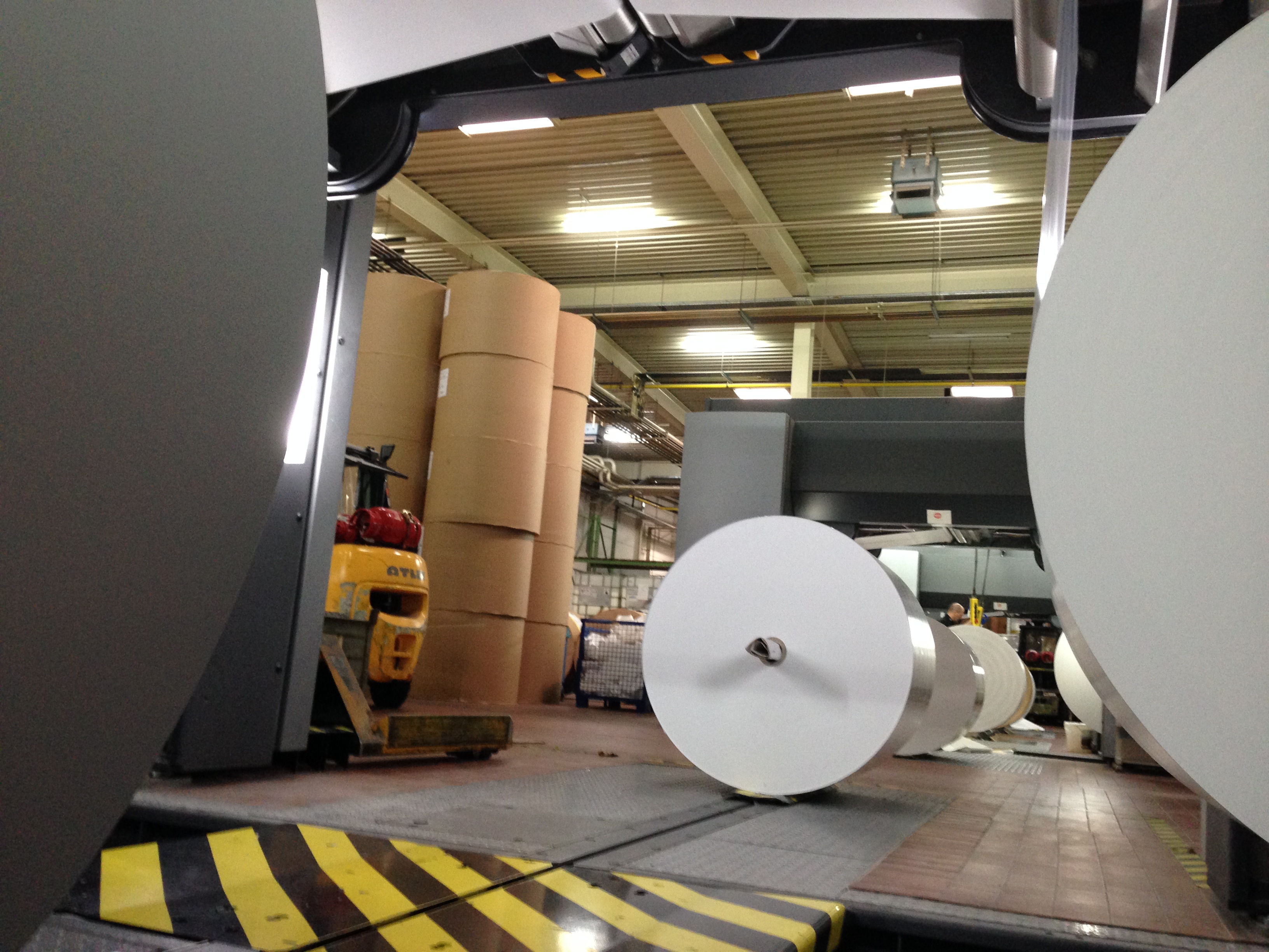 Und wir haben auch ein paar Zahlen mitgenommen: Mit einer 1250 Kilogramm schweren Papierrolle (siehe oben), die ausgerollt etwa 14 Kilometer lang und 88 Zentimeter breit ist, lassen sich 30.000 Exemplare eines Bogens (mit 16 impulse-Seiten) drucken. Wenn man rechnet, dass wir in einem durchschnittlichen impulse-Heft etwa acht Bögen brauchen und die gedruckte Auflage bei etwa 100.000 liegt, kommen wir auf 28 Rollen, das entspricht (wenn ich mich nicht verrechnet haben) einer Länge von 392 Kilometer pro Ausgabe…