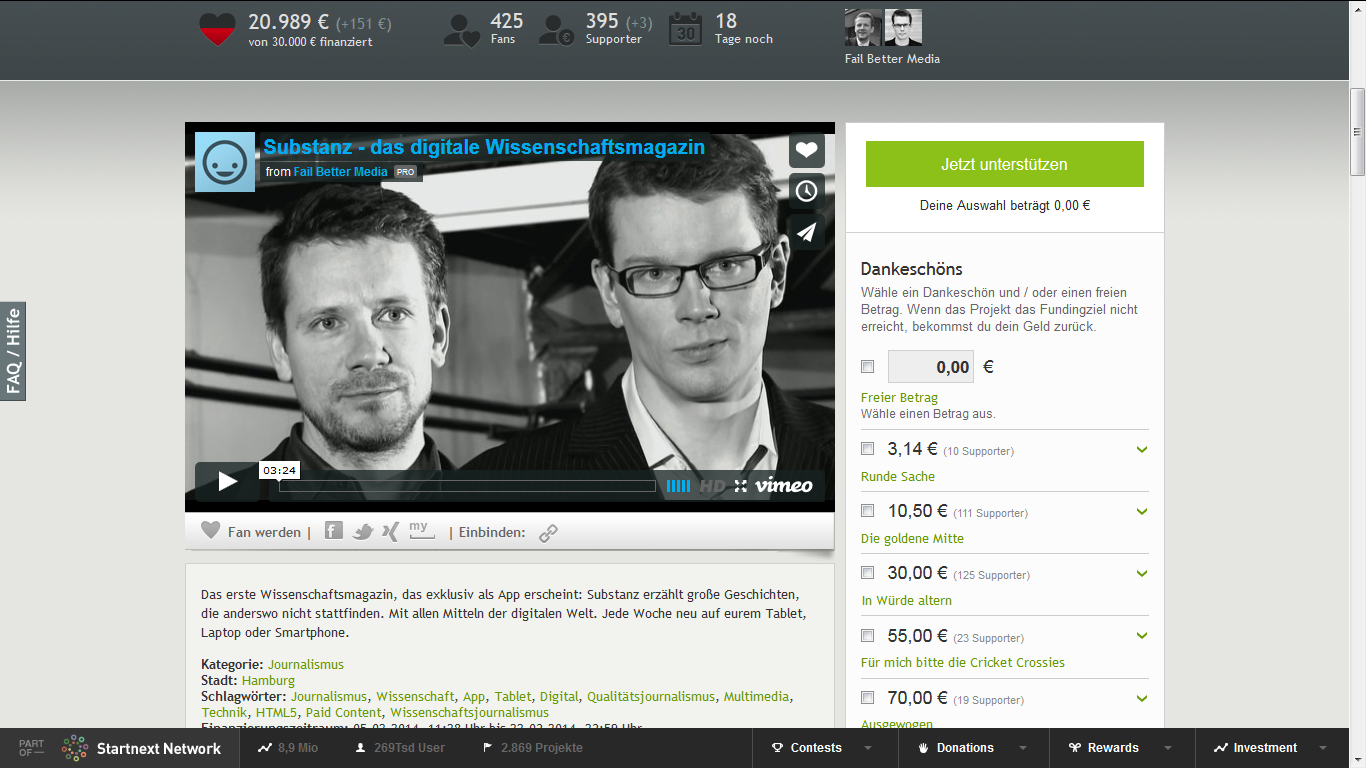 Also, liebe Leser: Wenn Sie das Gefühl haben, dass es heute eher zu wenig als zu viel guten Qualitätsjournalismus gibt, wenn Sie Lust auf Experimente haben, ein junges journalistisches Start-up unterstützen möchten und eher an kleine Schnellschiffe statt an große Flaggschiffe glauben, dann sind Sie mit wenigen Klicks dabei: Hier ist die Adresse der Crowdfunding-Plattform, wo Sie einen Betrag überweisen können: http://www.startnext.de/substanz. Schon mit 3,14 Euro („eine Runde Sache“) sind Sie dabei, zwei Unterstützer haben bereits 957 Euro („Weckruf“) überwiesen.