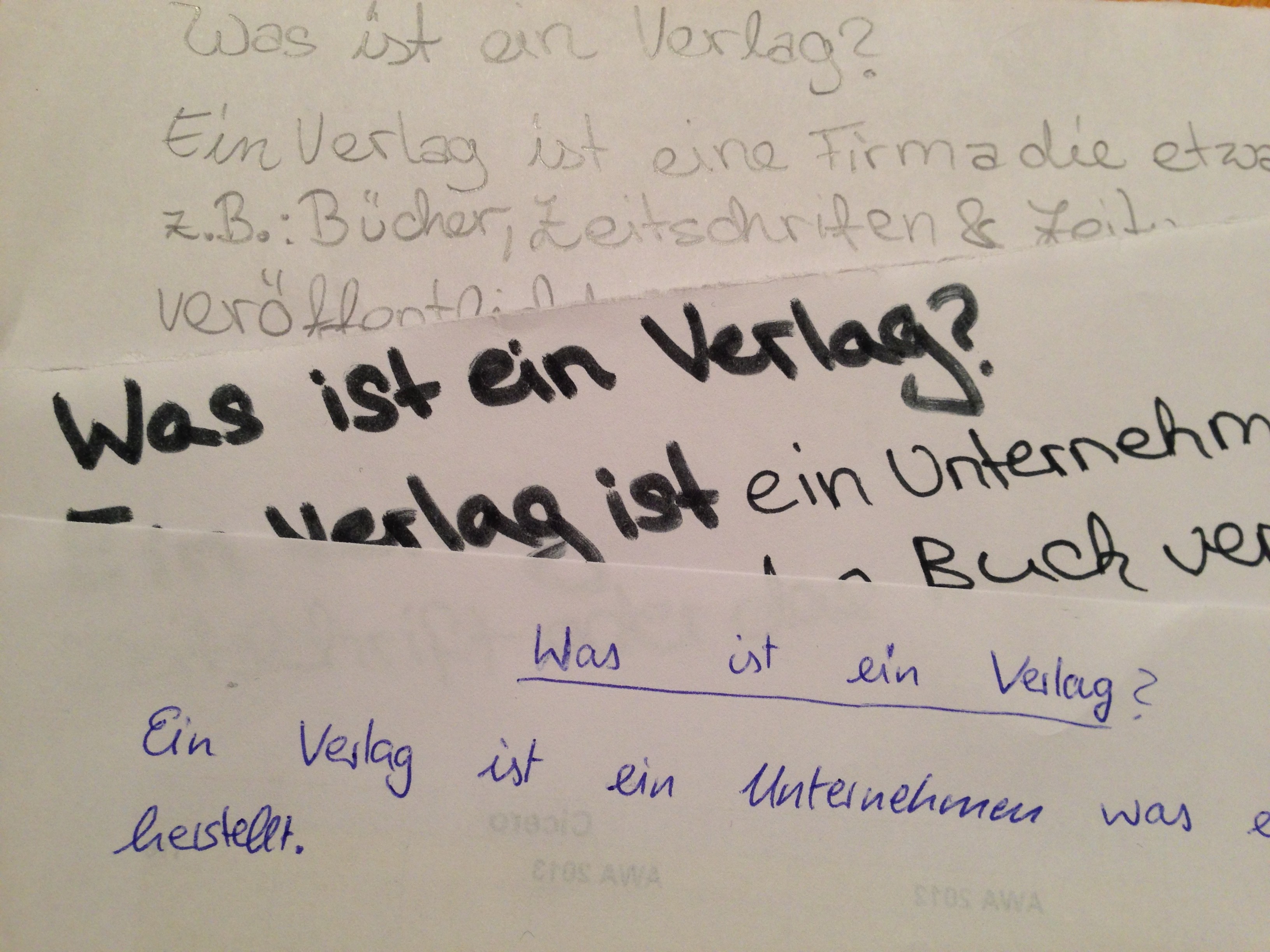 Was ist eigentlich ein Verlag, wollte ich zum Schluss wissen (ein bisschen wie in der Schule, die für sie an diesem Tag ausfiel…). „Ein Verlag ist eine Firma, die etwas herstellt“, schrieb ein Mädchen, „z. B. Bücher, Zeitschriften & Zeitungen und die veröffentlicht.“ Was Verlage sonst noch so tun, erkläre ich im nächsten Jahr…