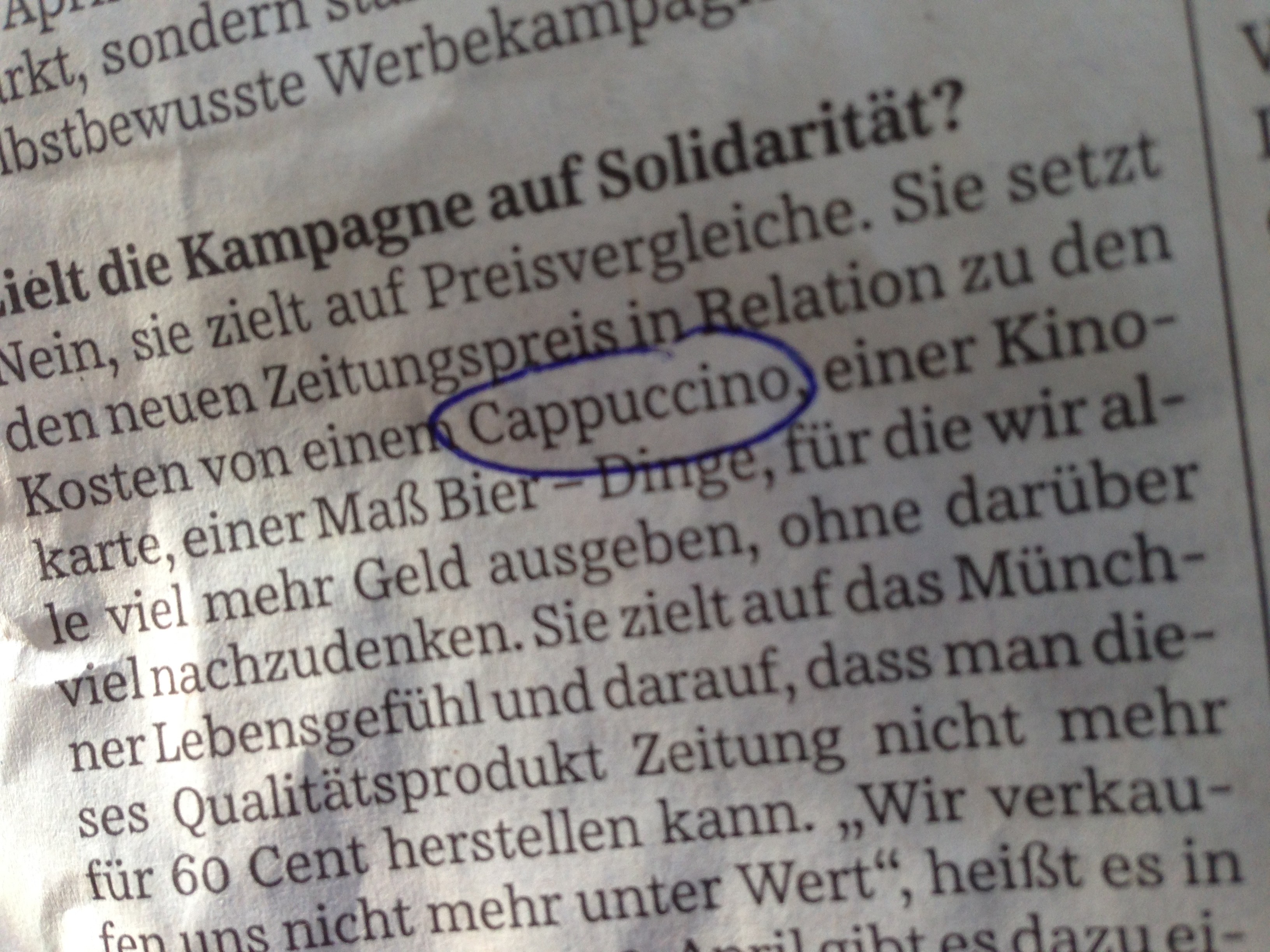 Vielleicht gibt es ja bald eine neue Referenzwährung für Qualitätsjournalismus: nämlich den Cappuccino. Der Insolvenzverwalter, der gerade die Münchner Abendzeitung zu retten versucht, wirbt für eine Preiserhöhung (von 60 Cent auf 1 Euro), indem er Vergleiche heranzieht, wie er heute im Interview mit der „Süddeutschen Zeitung“ ankündigte: Die Kampagne setzte „den neuen Zeitungspreis in Relation zu den Kosten von einem Cappuccino, einer Kinokarte, einer Maß Bier“.