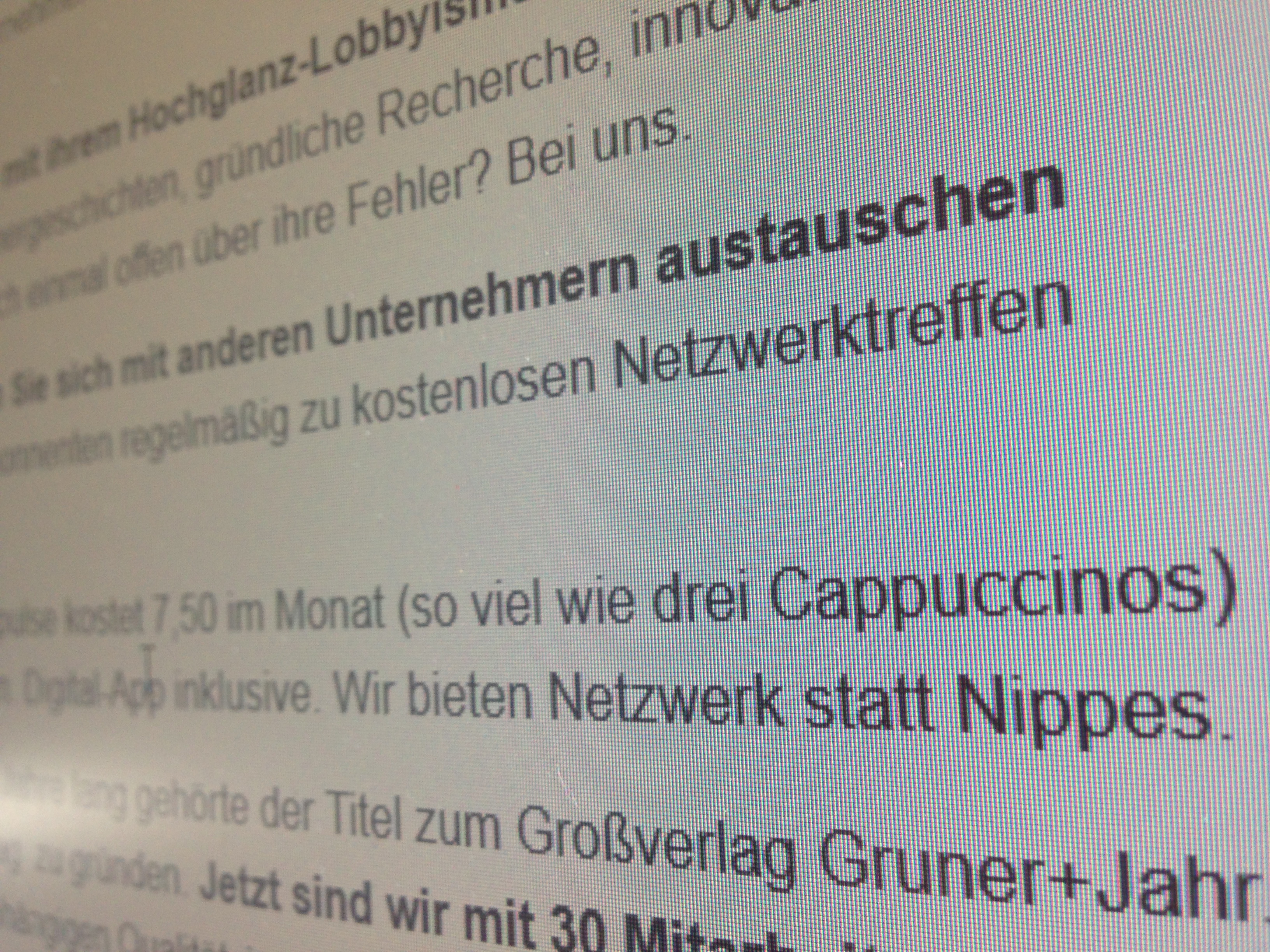 Vielleicht hat er ja vorher mal unsere Website besucht. Dort machen wir seit längerer Zeit darauf aufmerksam, dass ein impulse-Heft „soviel wie drei Cappuccinos“ kostet.