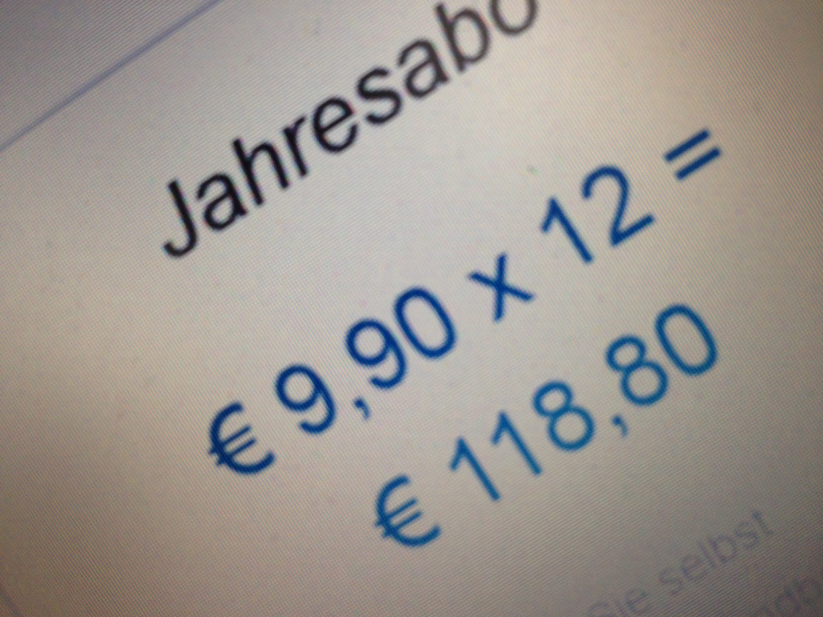 Wir haben uns jetzt entschieden, 9,25 Euro netto, also 9,90 Euro brutto, zu verlangen und damit noch unter der 10-Euro-Schwelle zu bleiben, so wie es uns einige Unternehmer empfohlen hatten. Aufs Jahr gerechnet kommen unsere Kunden damit auf 111 Euro netto und 118,80 Euro brutto.